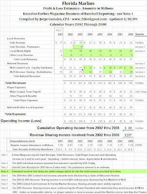 Forbes recently released its annual Business of Baseball issue for 2009. One year ago I started this blog by looking very closely at the Forbes numbers as they pertained to the Florida Marlins.