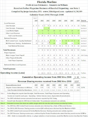 Below is a Profit and Loss financial statement I have put together for the Florida Marlins since 2002 using Forbes Business of Baseball figures.