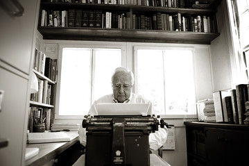 “Nothing good was ever written in a large room,” David McCullough says, and so his own office has been reduced to a windowed shed in the backyard of his Martha’s Vineyard home. Known as “the bookshop,” the shed does not have a telephone or running water. Its primary contents are a Royal typewriter, a green banker’s lamp, and a desk, which McCullough keeps control over by “flushing out” the loose papers after each chapter is finished. The view from inside the bookshop is of a sagging barn surrounded by pasture. To keep from being startled, McCullough asks his family members to whistle as they approach the shed where he is writing.