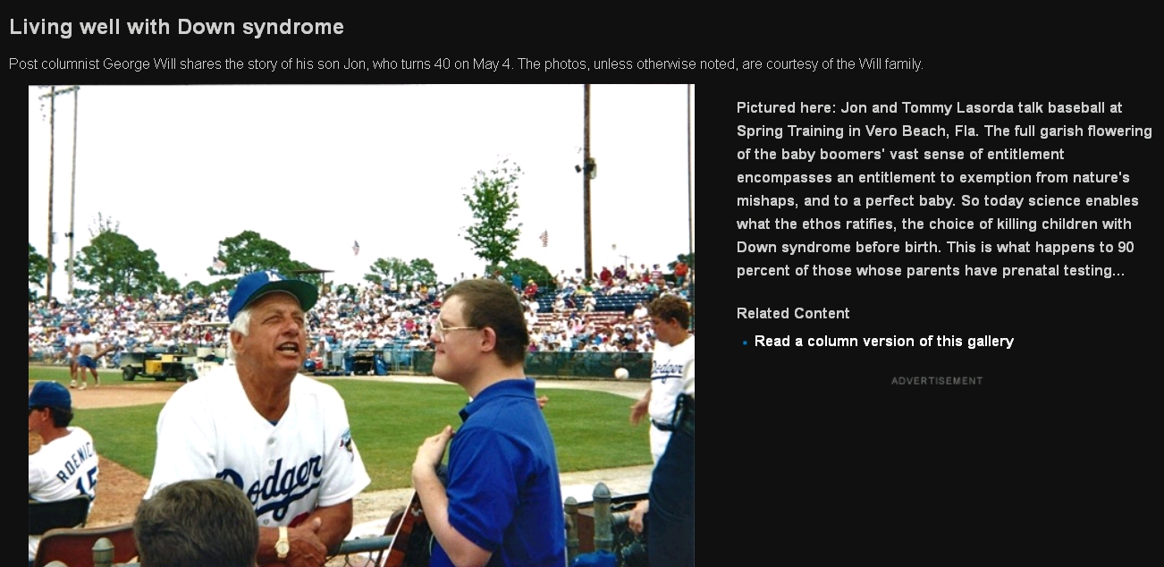 This era has coincided, not just coincidentally, with the full, garish flowering of the baby boomers’ vast sense of entitlement, which encompasses an entitlement to exemption from nature’s mishaps, and to a perfect baby. So today science enables what the ethos ratifies, the choice of killing children with Down syndrome before birth. That is what happens to 90 percent of those whose parents receive a Down syndrome diagnosis through prenatal testing.