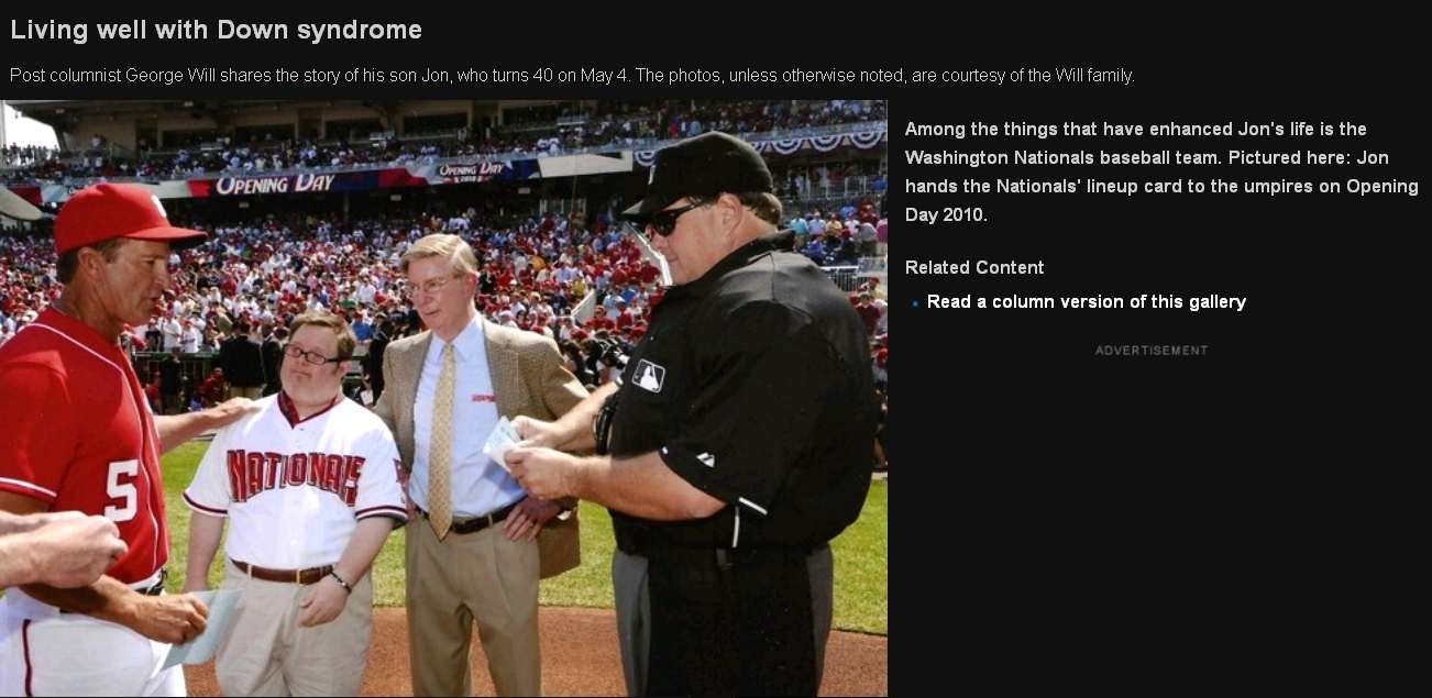 Judging by Jon, the world would be improved by more people with Down syndrome, who are quite nice, as humans go. It is said we are all born brave, trusting and greedy, and remain greedy. People with Down syndrome must remain brave in order to navigate society’s complexities. They have no choice but to be trusting because, with limited understanding, and limited abilities to communicate misunderstanding, they, like Blanche DuBois in “A Streetcar Named Desire,” always depend on the kindness of strangers. Judging by Jon’s experience, they almost always receive it.Two things that have enhanced Jon’s life are the Washington subway system, which opened in 1976, and the Washington Nationals baseball team, which arrived in 2005. He navigates the subway expertly, riding it to the Nationals ballpark, where he enters the clubhouse a few hours before game time and does a chore or two. The players, who have climbed to the pinnacle of a steep athletic pyramid, know that although hard work got them there, they have extraordinary aptitudes because they are winners of life’s lottery. Major leaguers, all of whom understand what it is to be gifted, have been uniformly and extraordinarily welcoming to Jon, who is not.