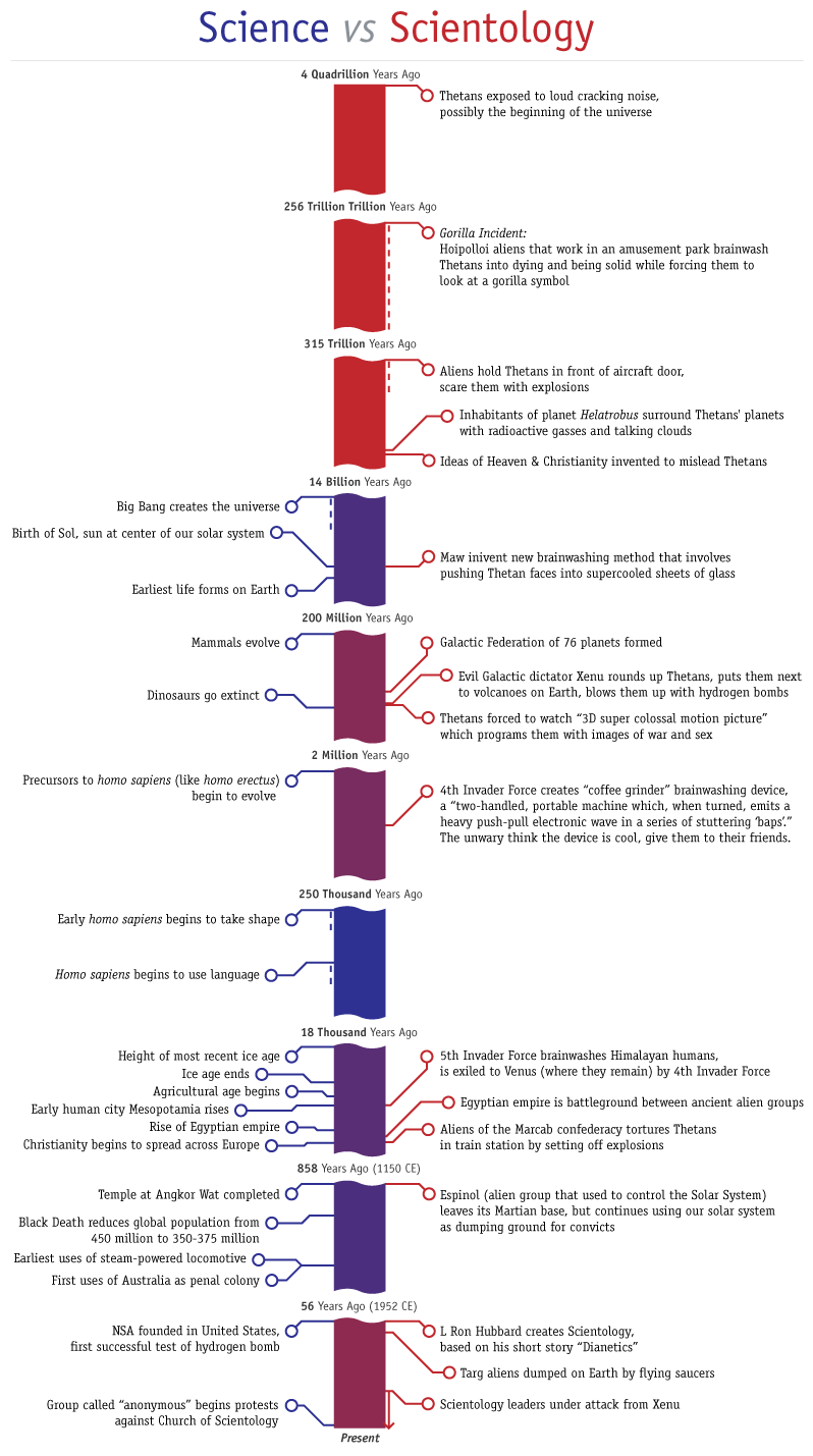 I see Lafayette Ronald Hubbard as a worthy predecessor to Oliver Stone as a storyteller. When Stone couldn’t decide who to blame for the JFK assassination in his movie, he just blamed everyone. Similarly, when Hubbard was making up his science fiction stories, the ‘maybe I should make this remotely believable’ factor was noticeably absent. But that was just a warm up. Turning those stories in a ‘belief system’ was a task worthy of an Ahmadinejad denying the Holocaust, as the graphand the following bullet points might suggest: