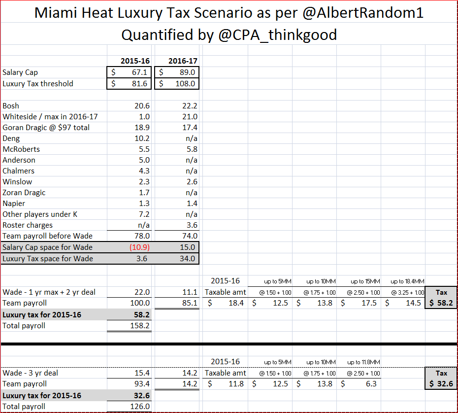 The deal worth the most to Wade is the 1 year max with the promise of a 2 year deal to come. But the cost is prohibitive to the Heat, given that it results in a $58 million dollar luxury tax.